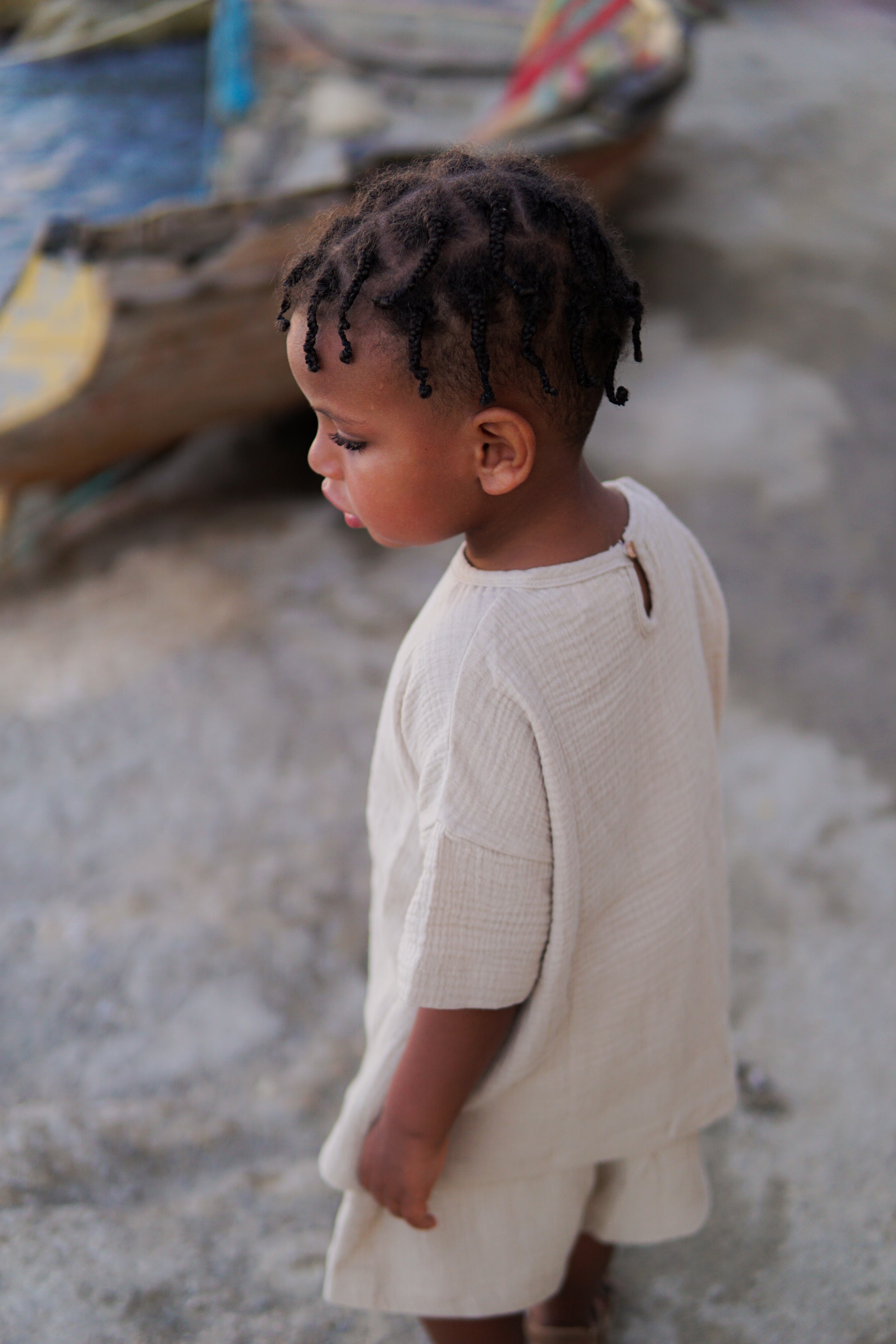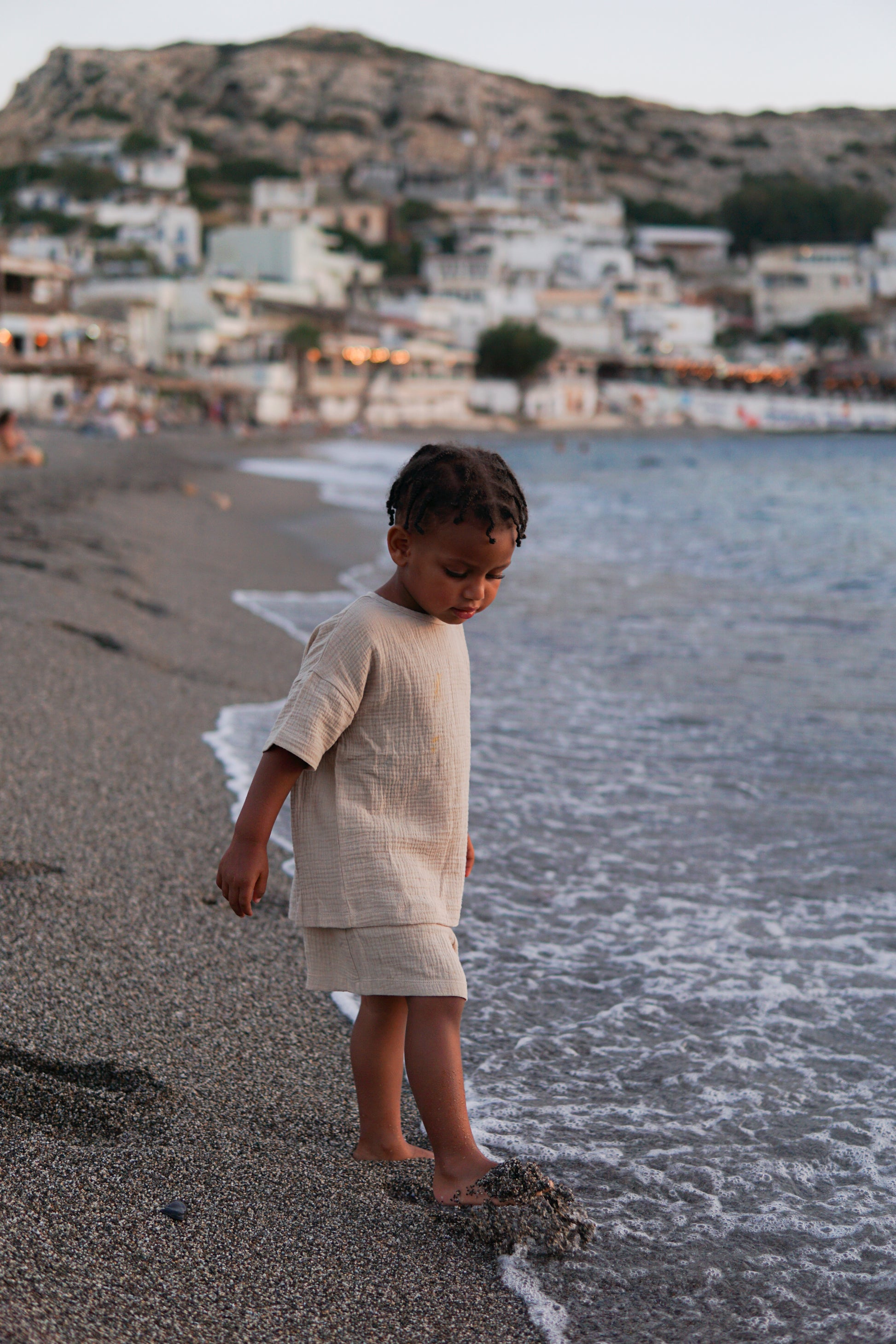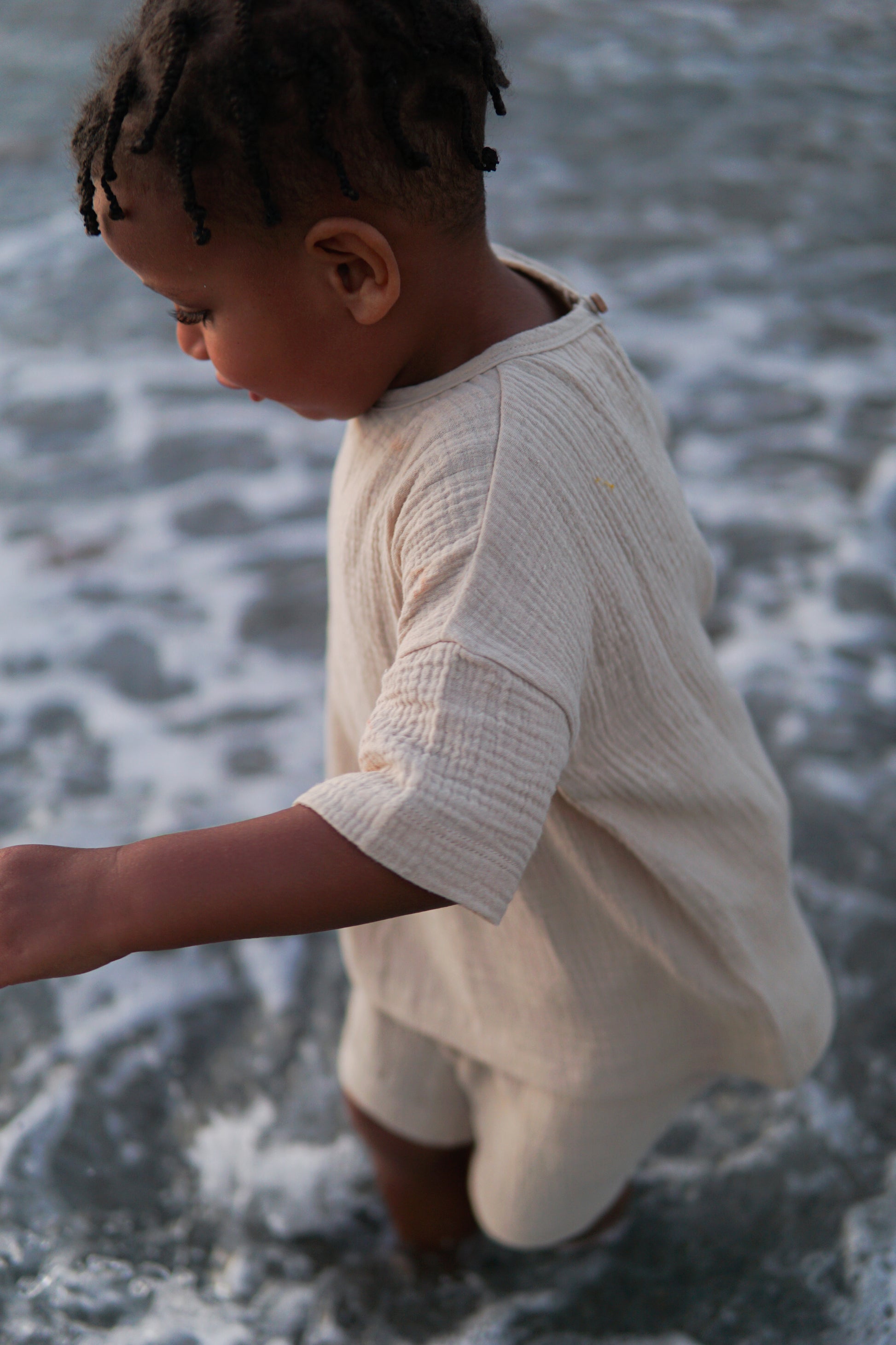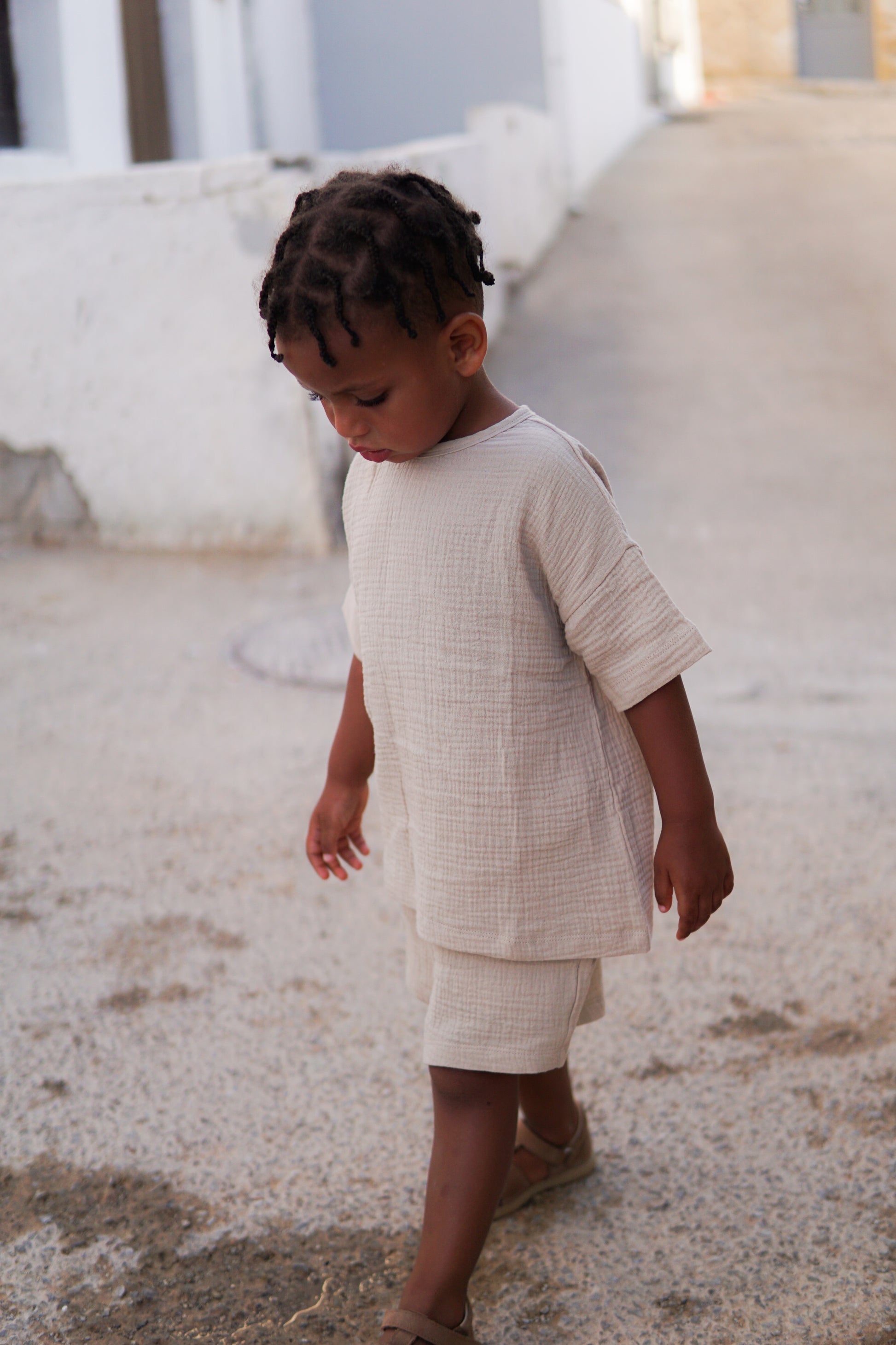 Leichtes oversized Musselin Set, bestehend aus lässigem oversized T-Shirt mit Holzknopf am Nacken und weiten lockeren Shorts mit praktischen Taschen. Aus hochwertiger, weicher Bio-Baumwolle. Euer Lieblingsteil für warme Sommertage.